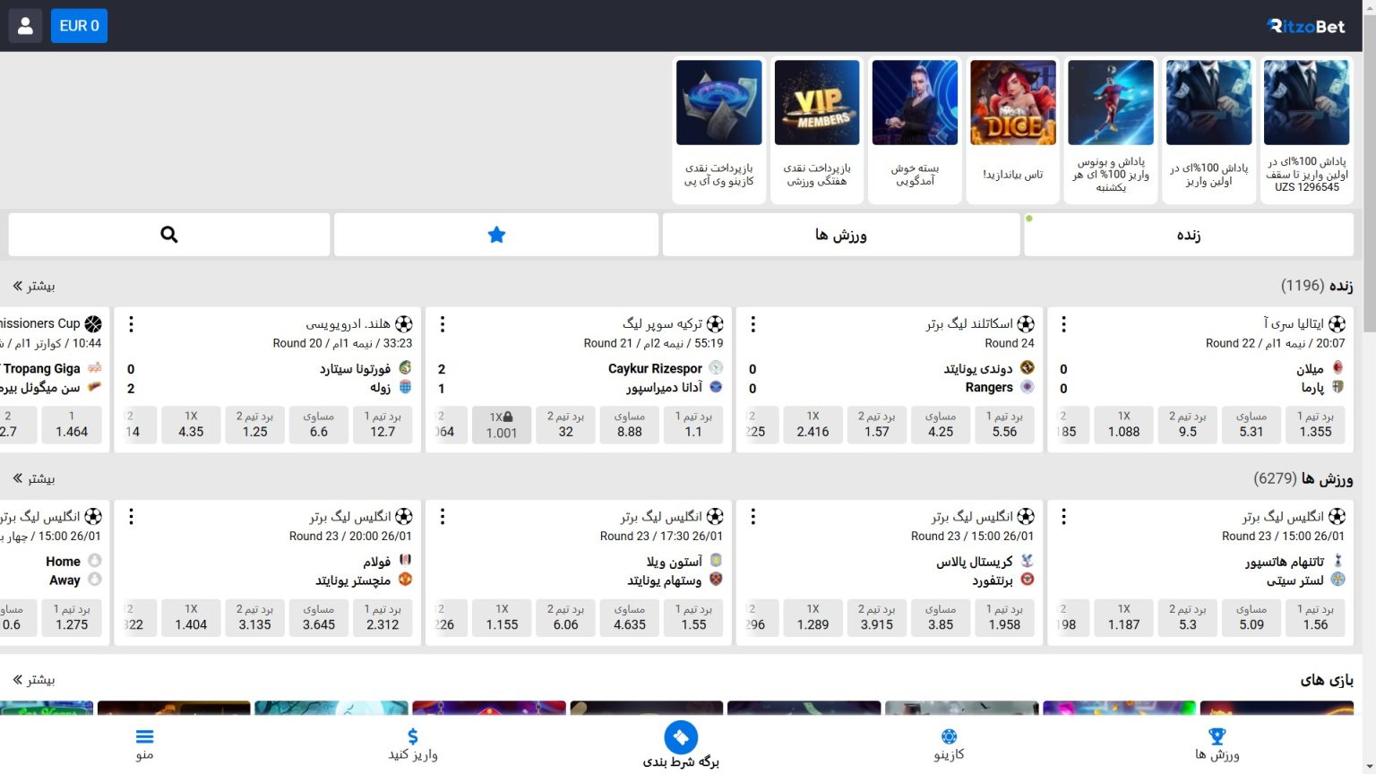 بخش پیش بینی ورزشی در ریتزوبت (RitzoBet) یکی از جذاب ترین قسمت های سایت است. کاربران می توانند روی بازی های قبل از شروع (Pre-Match) یا بازی های زنده (Live Betting) شرط بندی کنند.